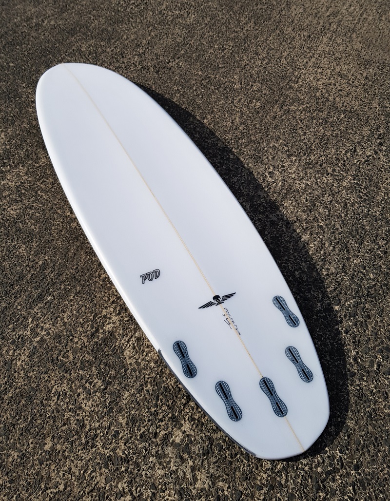 You will notice straight away i have altered the tail to a arced diamond to suit the added quad fin setup, i have also slightly pulled in the nose to give it a more shortboard feel and ride, as a quad fin this new Pod is really fun to ride and will be a one to beat this summer.